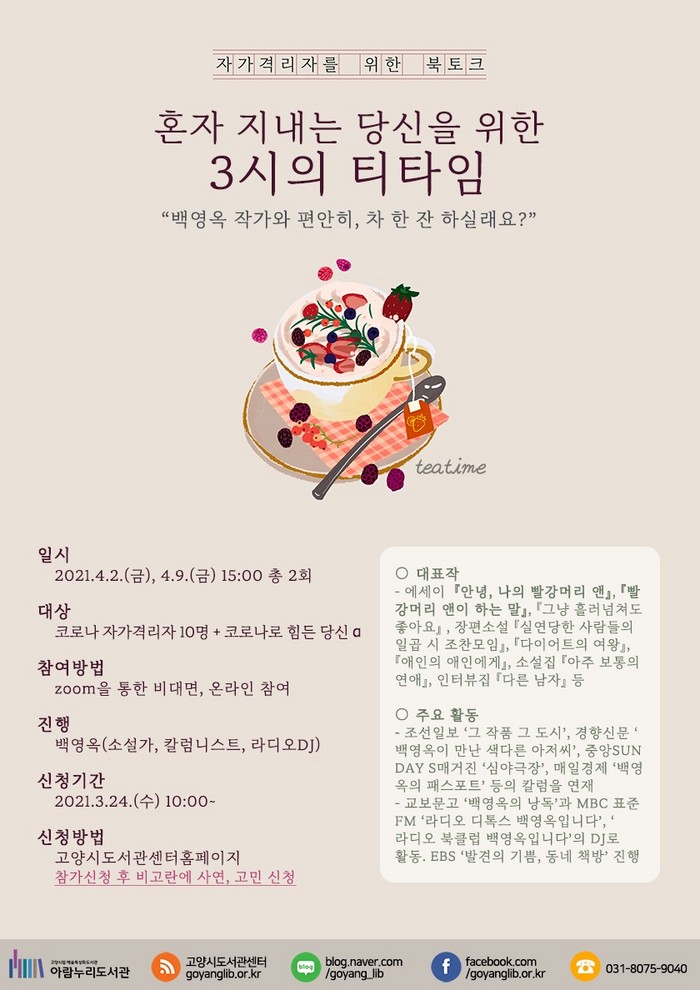 [부자동네타임즈 김인수기자] 고양시 아람누리도서관이 코로나19로 자가격리 중인 시민들을 위한 비대면 행사 ‘혼자 지내는 당신을 위한, 오후 3시의 티타임’을 오는 4월 2일(금)과 9일(금)에 2회에 걸쳐 개최한다.