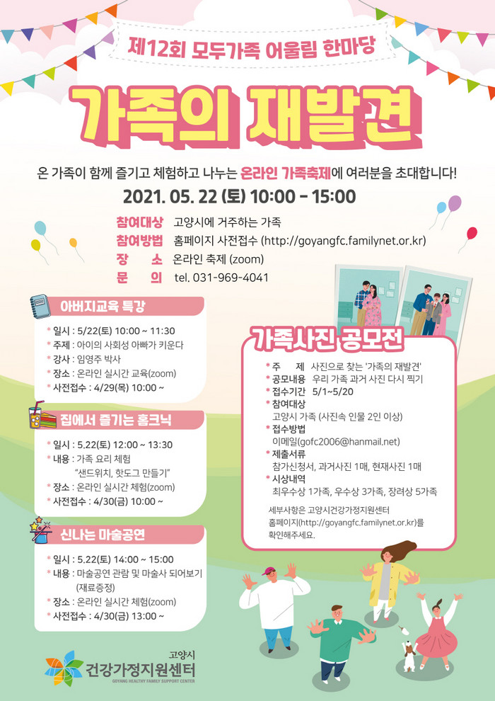 [부자동네타임즈 김인수기자] 고양시가 오는 22일‘제12회 모두가족 어울림 한마당’축제를 온 가족이 집에서 온라인으로 즐길 수 있도록 준비했다.