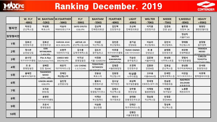 [부자동네타임즈 김인수기자] 한국 최대 입식격투기 단체 MAX FC가 26일 2019년 마지막 체급별 랭킹을 발표했다. 총 11개 체급의 12명의 챔피언과 더불어 체급별 10위까지 랭킹을 발표했다.
