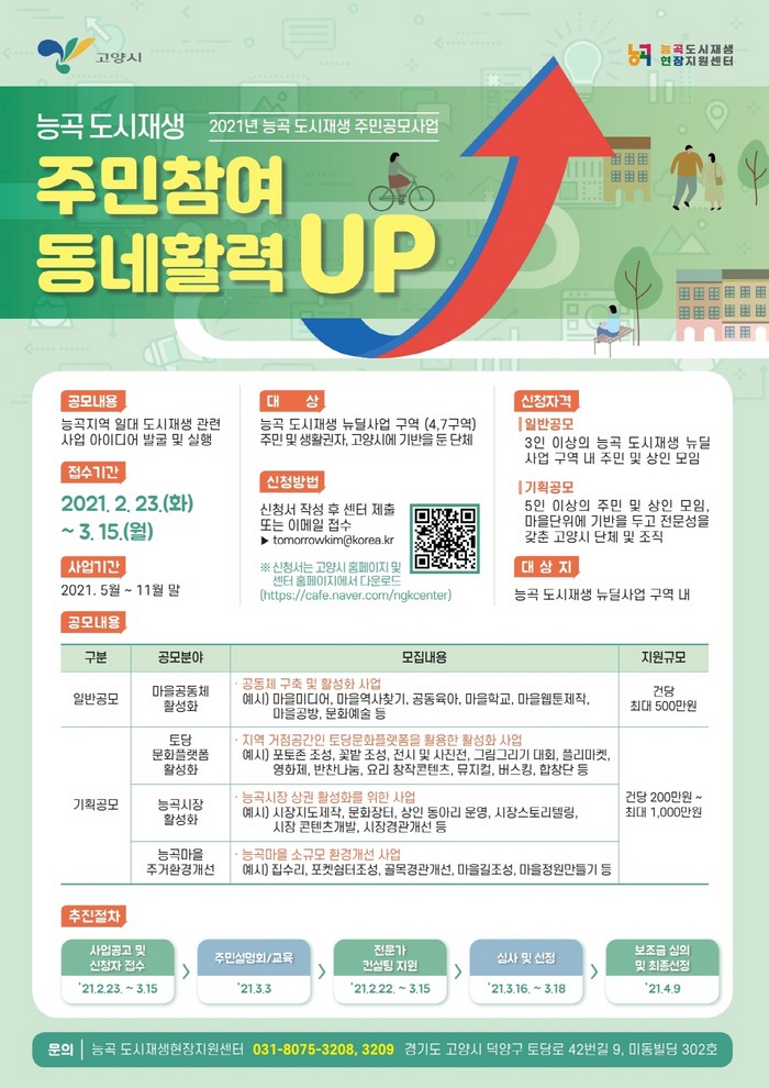 [부자동네타임즈 김인수기자] 고양시가 오는 3월 15일까지 능곡 도시재생 뉴딜사업 구역을 대상으로 2021년 도시재생 주민공모사업 ‘능곡 도시재생 주민참여 동네활력 UP’ 신청 접수를 실시한다.
