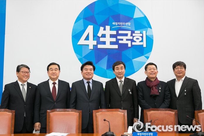 (서울=포커스뉴스) 24일 오후 서울 여의도 국회 새정치민주연합 원내대표실에서 열린 누리과정예산 논의를 위한 여야 원내지도부 간담회 참석자들이 기념사진을 찍고 있다. 왼쪽부터 새누리당 조원진 원내수석부대표, 김정훈 정책위의장, 원유철 원내대표, 새정치민주연합 이종걸 원내대표, 최재천 정책위의장, 이춘석 원내수석부대표.