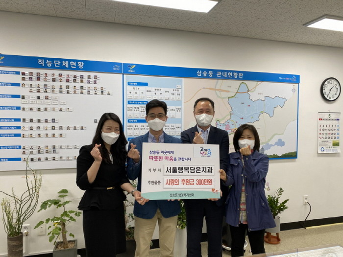 [부자동네타임즈 김인수기자] 고양시 덕양구 삼송동행정복지센터(동장 김동원)는 지난 3일 관내 서울행복담은치과(원장 박철우)에서 5월 가정의 달을 맞이해 어려운 가정을 위해 써 달라며 300만 원을 기부했다.