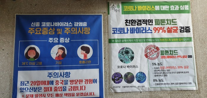 99%살균한다는 홍보물이 버젓이 떠있었다. 또한 노블레스(구리시 소재)라는 판매회사는 친환경 피톤치드 산림욕기S200 제품이 코로나바이러스 99%살균검증‘이라는 홍보물을 통하여 홍보하고 있었다.
