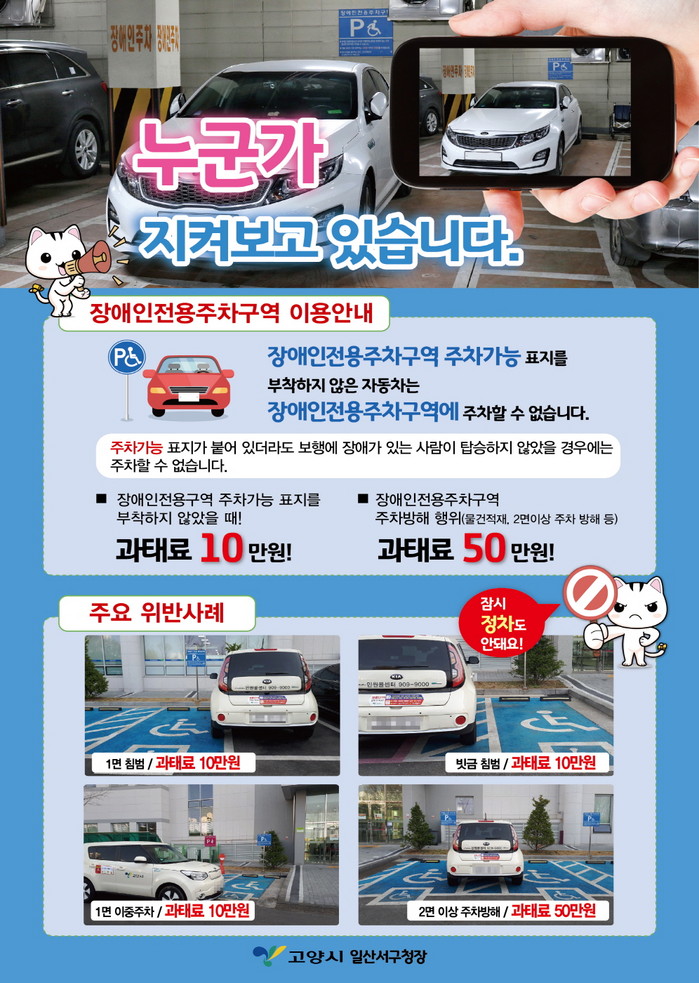 [부자동네타임즈 김인수기자] 고양시 일산서구(구청장 이재혁)는 장애인전용주차구역에서 주차위반 및 방해 행위가 계속 발생해 민원이 끊이지 않음에 따라, 이를 근절하기 위해 4월부터 특별 지도점검을 실시한다.