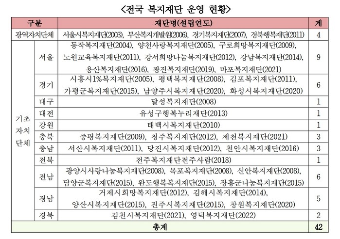 [부자동네타임즈 김인수기자] 주민들의 복지수요가 증가하고 지자체 행정에서 복지분야 사업과 예산이 차지하는 비중이 높아짐에 따라 복지재단 필요성이 높아지고 있다. 2003년 서울복지재단이 처음 설립된 이후로 현재 전국 42곳 지자체가 복지재단을 운영한다. 복지사업을 체계적으로 기획하고 관리하기 위해 복지재단을 운영하는 지자체가 증가하고 있다.