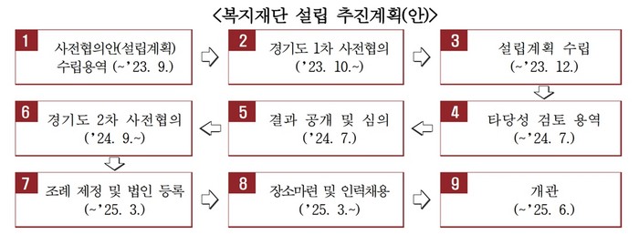 시민복지재단 설립을 위해 총 9단계의 절차가 진행되는 만큼 모든 절차를 완료하려면 재단설립까지 최소 2년 이상 소요될 것이라는 예상이다. 예산수립이 지연될수록 복지재단 설립이 늦어질 수 밖에 없어 조속한 예산수립과 사업추진이 필요한 시점이다.