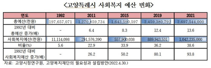 1992년 지방자치제 실시 이후 고양시 복지 예산은 크게 증가했다. 2021년 고양시 전체 예산은 2조 6970억원으로, 1992년 전체 예산 1976억원에 비해 13.6배 증가했다. 사회복지예산은 1992년 111억원(사회복지사업비)에서 2021년 1조 422억원으로 약 93배 증가했다. 전체예산에서 사회복지예산이 차지하고 있는 비율은 1992년 5.6%에서 2011년 22.9%, 2015년 33.9%, 2021년 38.6%로 급증했다. 증가한 복지예산만큼 사업수행기관, 수혜대상, 복지사업도 증가하여 복지사업을 보다 체계적이고 효율적으로 수행할 필요성도 높아졌다.