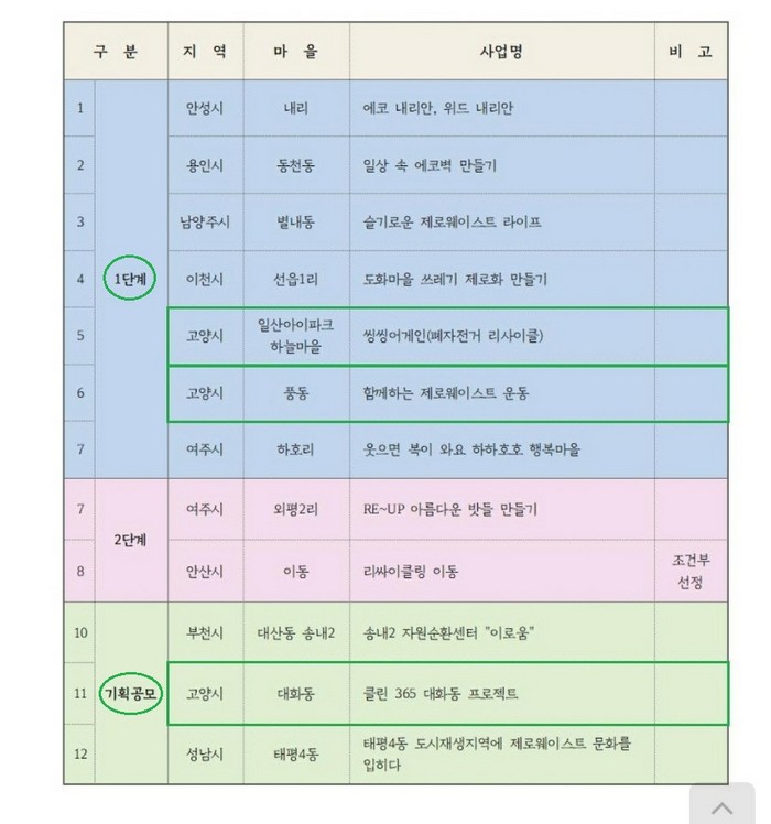 고양시에서는 1단계 마을(자원순환 주민역량강화 신규 마을)로 일산아이파크 하늘마을의 ‘씽씽어게인(폐자전거 리사이클)’과 풍동의 ‘함께하는 제로웨이스트 운동’이 선정됐다. 기획공모로는 대화동의 ‘클린 365 대화동 프로젝트’가 선정됐다.