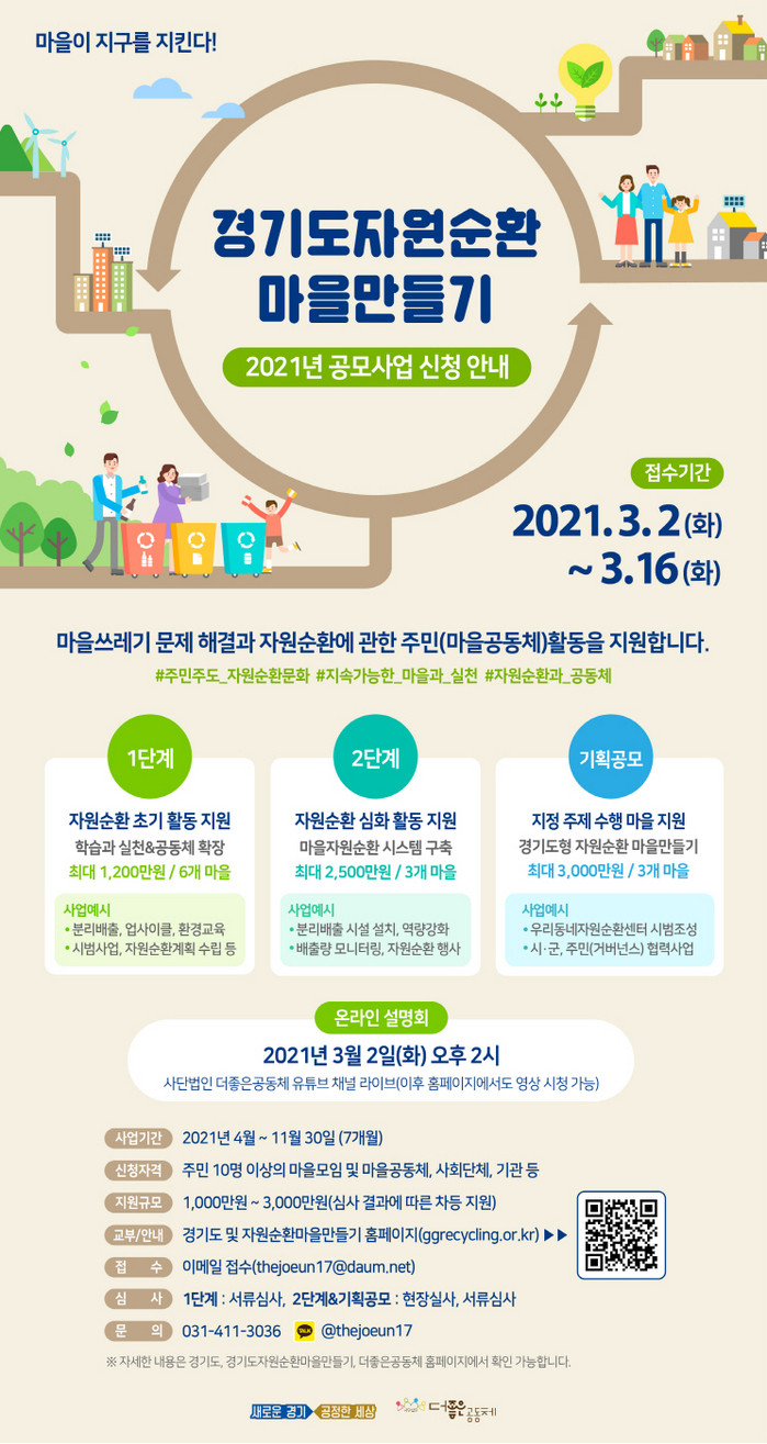 경기도 주최, 사단법인 더좋은공동체가 주관하는 ‘자원순환마을 만들기’는 마을 쓰레기 및 자원순환 관련 과제를 해결하고자 하는 10명 이상의 마을공동체 및 사회단체, 기관 등에 해당하면 누구나 지원할 수 있다. 그리고 공모를 통해 선정된 경기 지역 내 12개 마을공동체는 최대 1,200만원~3,000만원을 지원받아 사업을 추진할 수 있다.