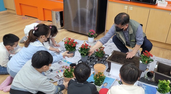 [사진설명] 원당돌봄센터매니저가 식물 관찰 일기를 작성하는 방법을 지도하고 있다.