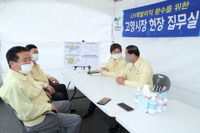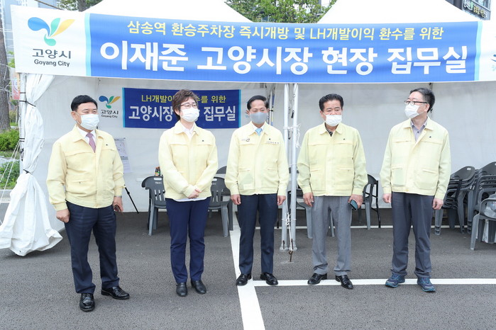 이재준 고양시장이 삼송역 환승주차장에 임시 현장집무실을 설치하고, 5월 11일부터 현장근무를 시작했다. LH 개발이익 환수를 위한 상징적인 강경조치로, 시민 불편을 외면하는 무분별한 LH개발방식에 경종을 울리기 위해서다.