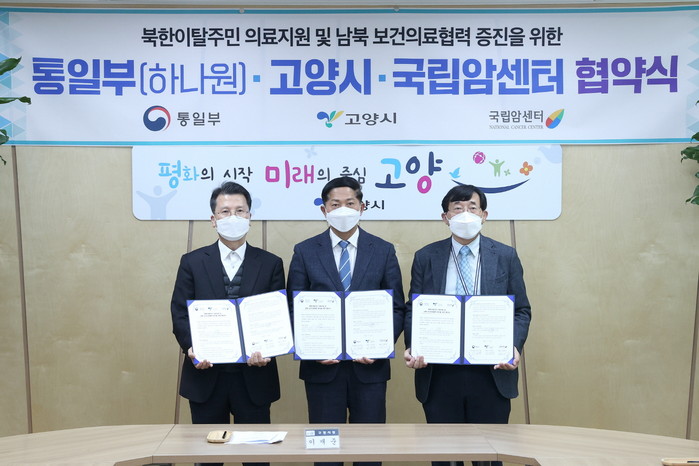 고양시와 하나원, 국립암센터는 상호 신뢰를 바탕으로 포괄적인 협력관계를 수립하고 북한이탈주민의 의료지원 및 남북 보건의료협력 증진을 위해 협력할 방침이다.