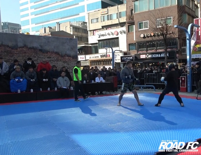 [부자동네타임즈 김인수기자] ROAD FC와 (주)PLAY1은 지난 8일 서울 마포구 서교동 홍대 걷고 싶은 거리 내 야외 특설무대에서 ‘맞짱의 신’ 1차 예선을 진행했다.