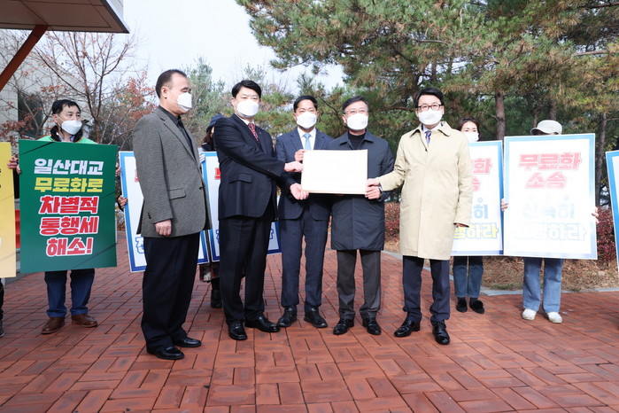17일 이한규 경기도 행정2부지사, 이재준 고양시장, 정하영 김포시장, 최종환 파주시장은 일산대교 남단에 위치한 일산대교(주)를 방문해 통행료 선지급 조건 협의서를 전달하고 일산대교(주)에 무료통행 지속과 손실보상금의 일부 수령을 요청했다.