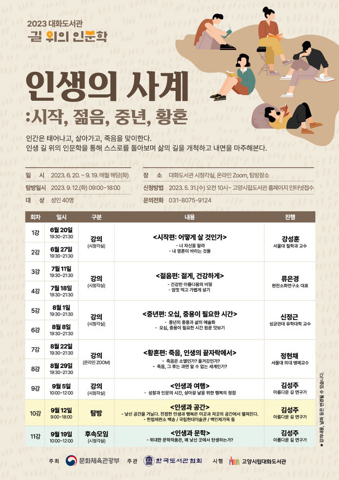구체적인 일정은 ▲강성훈 교수(서울대학교 철학과)의 어떻게 살 것인가 ▲류은경 대표(완전소화연구소 대표)의 젊게, 건강하게 ▲신정근 교수(성균관대 유학대학)의 오십, 중용이 필요한 시간 ▲정현채 명예교수(서울대학교 의학대학)의 죽음, 인생의 끝자락에서 ▲김성주 강사(아름다운 길 연구가)의 탐방 사전 강연 인생과 여행과 낯선 공간을 거니는 북촌 탐방 ▲후속모임 인생과 문학 순서로 진행된다.