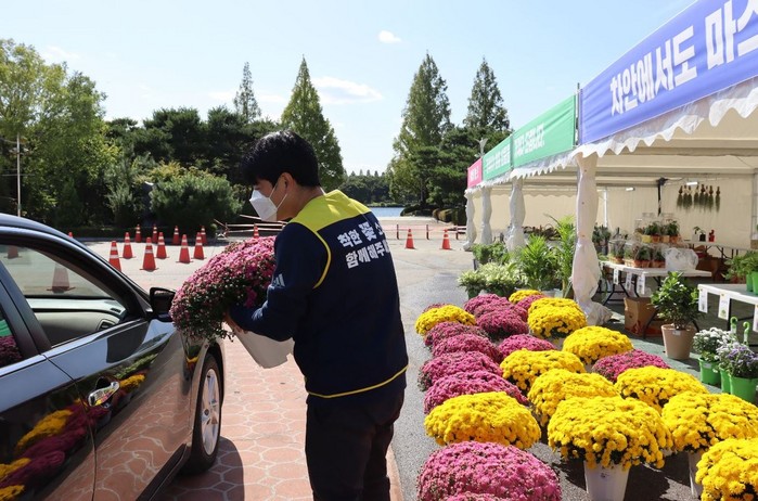 드라이브 스루 및 워킹 스루로 꽃을 살 수 있는 화훼 판매장에는 추석 연휴 기간 동안 국화, 공기정화식물, 다육식물 등을 구매하려는 시민들의 발길이 이어지며 활기가 넘쳤다.