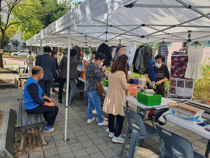 ‘노리마루 나눔장터’는 정발산동 이런 노리마루 사업의 일환으로 지난 5일 첫 선을 보였다. 여러 중고물품 중 재사용이 가능한 옷, 신발, 가방, 그릇 등 다양한 물품들을 판매하고 무료 가죽 팔찌 만들기 체험부스도 운영했다.