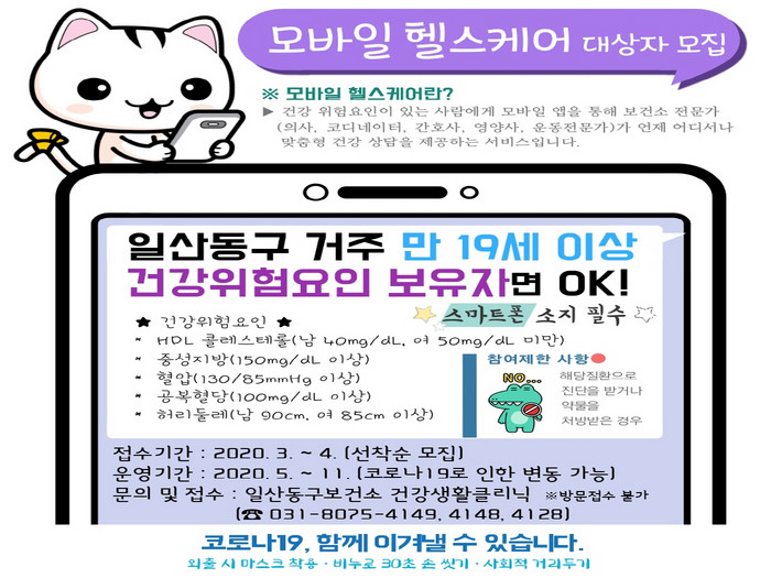 [부자동네타임즈 김인수기자] 고양시(시장 이재준) 일산동구보건소는 모바일 헬스케어 참여자를 모집한다고 25일 밝혔다.