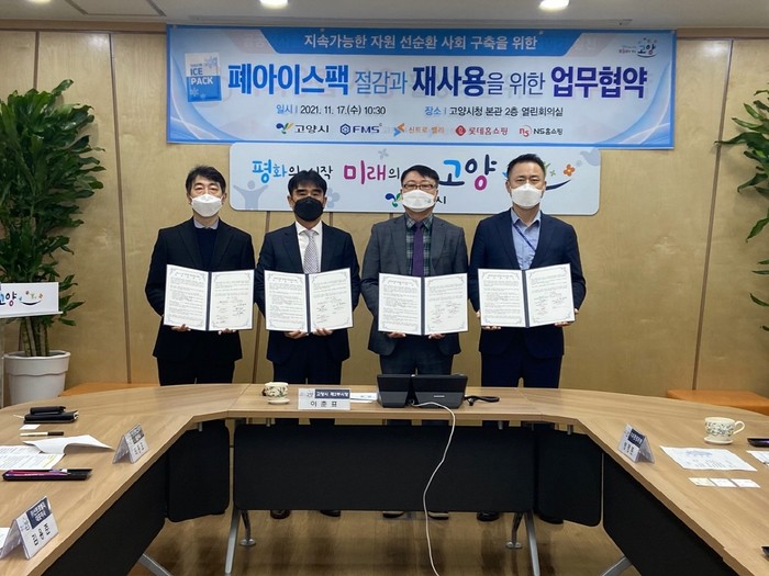이번 협약을 통해 고양시와 주식회사 에프엠에스코리아(대표이사 최동호), 주식회사 신트로밸리(대표이사 김용준), 주식회사 롯데홈쇼핑(대표이사 이완신), 주식회사 NS홈쇼핑(대표이사 조항목)는 폐아이스팩 선순환 구조를 만들어 2050 탄소중립 실현을 위해 상호 협력한다.