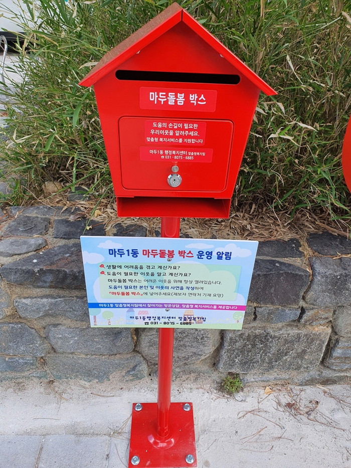 ‘마두돌봄 박스’는 10월부터 마두1동에서 추진하는 마을복지 사업의 일환으로 진행된다. 도움이 필요한 이웃에 대한 제보와 복지서비스 관련 건의사항을 주민들이 투서로 전달하면 맞춤형복지팀에서 주기적으로 수거하여 확인하고 도움의 손길이 필요로 하는 서비스를 맞춤형복지를 제공할 예정이다.
