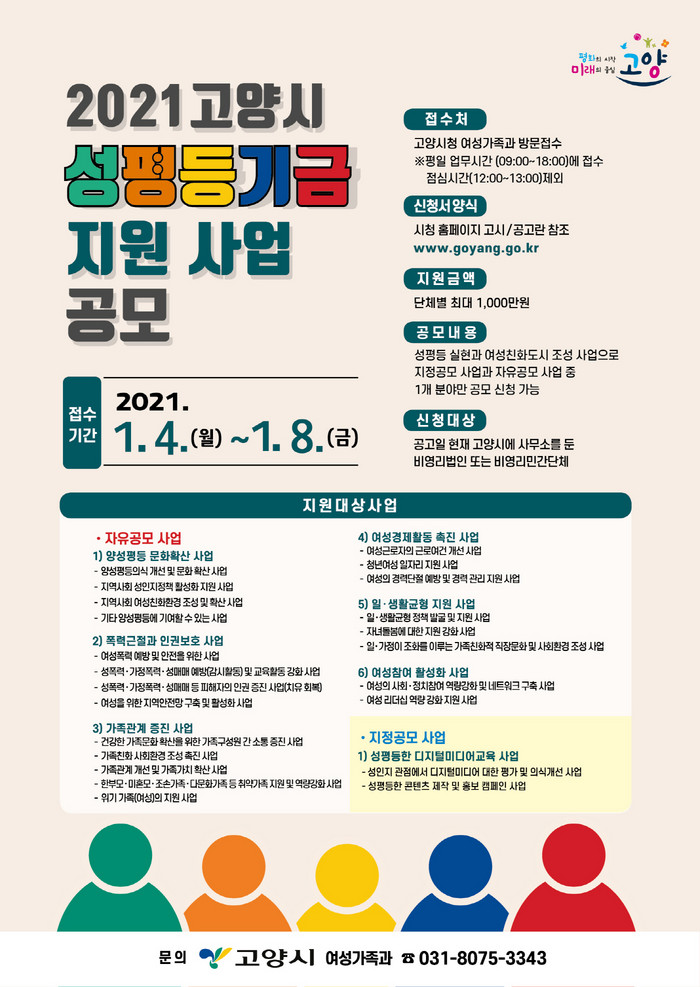 [부자동네타임즈 김인수기자] 고양시가 2021년도 고양시 성평등기금 지원사업을 공개모집한다. 지원 금액은 총 9천만 원이며, 사업의 규모와 성격에 따라 최대 1천만 원까지 지원한다.