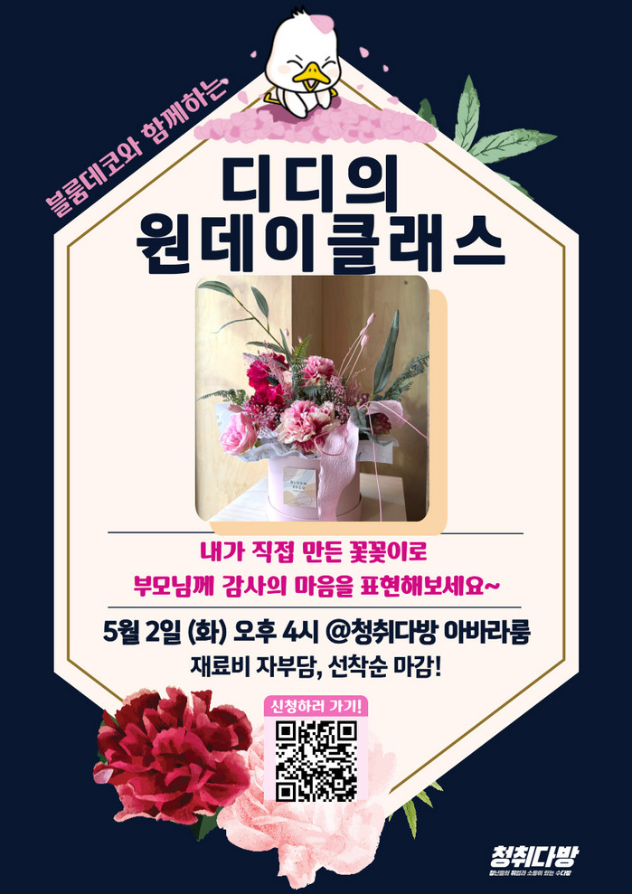 청취다방에서 진행되는 이번 원데이 클래스는 5월 가정의 달의 맞아 부모님께 감사의 마음을 전하는 카네이션 조화 꽃꽂이 만들기이다. 수업은 5월 2일(화) 14:00에 청취다방(화정터미널 2층)에서 진행되며, 재료비는 자부담이다.