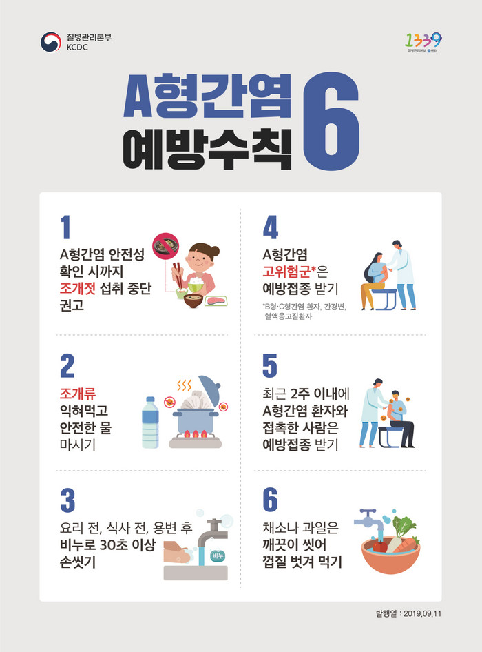 보건소 관계자는 “A형간염은 대변으로부터 경구로 감염되는 질환이기 때문에 개인위생 관리가 가장 중요하다. 끓인 물과 충분히 익힌 음식을 섭취하고, 화장실을 사용한 후와 외출 후에는 손을 깨끗이 씻어야 한다. A형간염에 대한 면역력이 없는 소아, 성인, 환자의 접촉자, 고위험군은 예방접종을 적극 권고한다.”고 말했다.