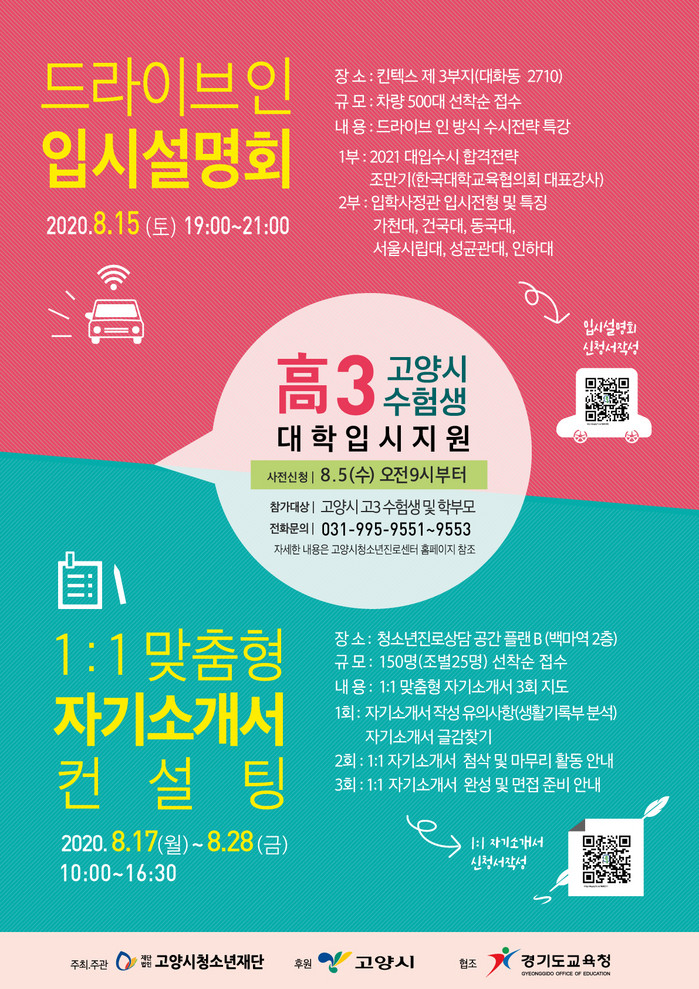 시 관계자는 “이번 입시설명회가 코로나19로 인한 등교지연으로 대학 입시에 대해 불안했던 수험생과 학부모의 불안감을 해소하고, 수시 맞춤형 콘텐츠 제공을 통해 고양시 수험생에게 차별화된 교육지원 체계를 마련하는 계기가 되길 바란다.”고 말했다.