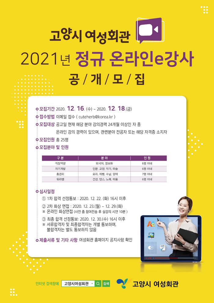 시 여성가족과 관계자는 “고양시 여성회관은 지난 9월 ‘온라인 단기특별 강사 공모’에서 경기도 여성회관들 중 처음으로 화상시연 면접 방식으로 강사를 선발했는데 수강생 대상으로 실시한 온라인강사의 만족도가 96%에 이를 정도로 높았다.”며, “이번 ‘정규 온라인e강사 공개모집’에서도 편견을 배제한 블라인드 방식의 화상강의 시연 면접을 통해, 강의를 실제로 능숙하게 진행할 수 있는 실력있는 강사를 선발함으로써 매우 밀도있고 창의적인 온라인수업 진행이 가능할 것으로 기대한다.”고 말했다.