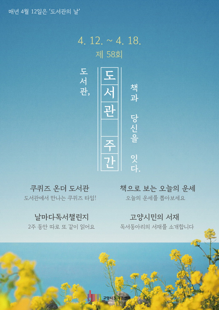 도서관 주간 프로그램과 관련한 자세한 사항은 고양시도서관센터 홈페이지에서 확인하면 된다.