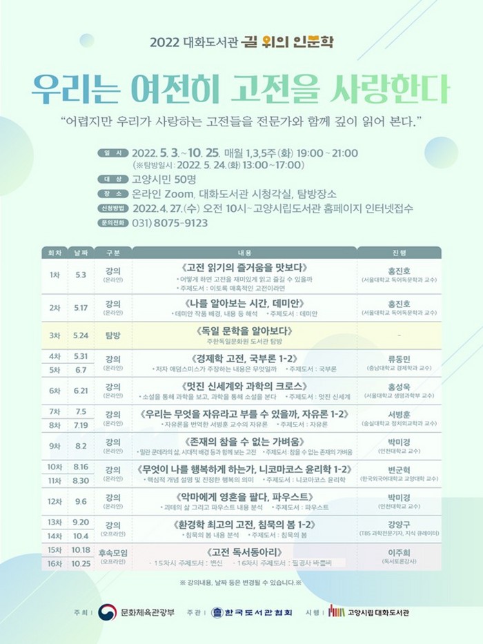 대화 도서관은 이번 ‘길 위의 인문학’ 프로그램을 우리는 여전히 고전을 사랑한다라는 이름으로 운영한다. 혼자 읽기 어렵지만 사랑받는 고전을 전문가와 함께 깊이있게 읽어보는 프로그램이다.