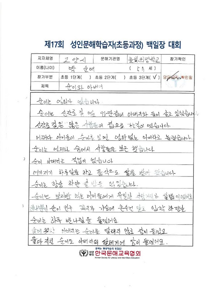 [부자동네타임즈 김인수기자] 고양시의 ‘높빛희망학교’가 제17회 성인문해학습자 백일장 대회에 참가해 3명의 수상자를 배출했다. 수상자 중 최고령은 70세 노인이다.