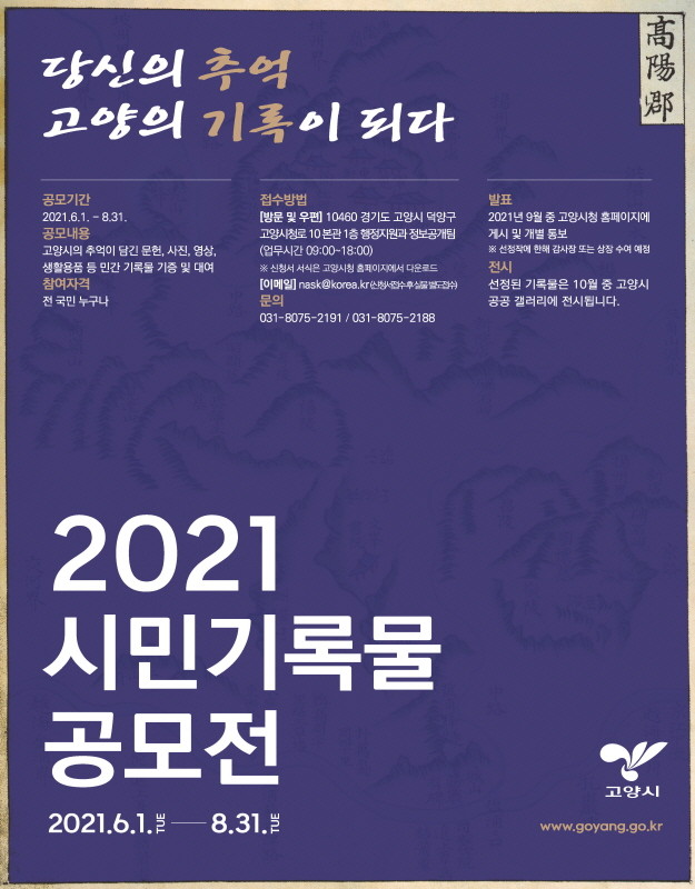 [부자동네타임즈 김인수기자] 고양시는 시 승격 30주년을 기념하고 시민과 함께 고양시의 추억과 향수를 공유하기 위해 내달 1일부터 ‘2021 시민기록물 공모전’을 개최한다.