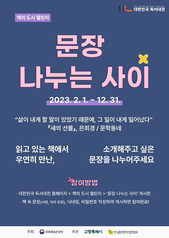 ‘문장 나누는 사이’에 참여하는 방법은 간단하다. 대한민국독서대전 홈페이지에 로그인 후 해당 게시판에 다른 사람에게 소개해주고 싶은 책 속의 문장을 게시하면 된다. 챌린지는 2월 1일부터 12월 31일 동안 참여할 수 있으며 혼자만 알고 있기 아까운 문구나 마음에 끌리는 문장을 이웃 시민과 나누는 시간이 될 예정이다.