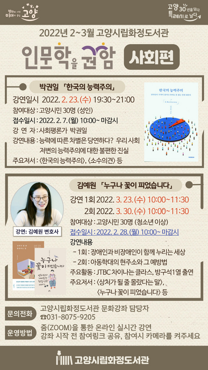 강연 신청은 2월 7일(월)부터 고양시 도서관센터 홈페이지에서 할 수 있다. 기타 자세한 사항은 화정도서관으로 문의하면 된다.