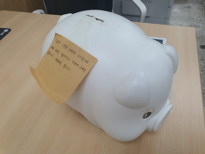 관계자에 따르면, 새벽녘에 출근한 직원이 주민센터 앞에서 “얼마 안되는 금액이라 부끄럽지만 폐지 주우시는 할머니나 주변에 어려운 분들에게 쓰였으면 합니다”라고 쓰여 있는 돼지 저금통을 발견했다.