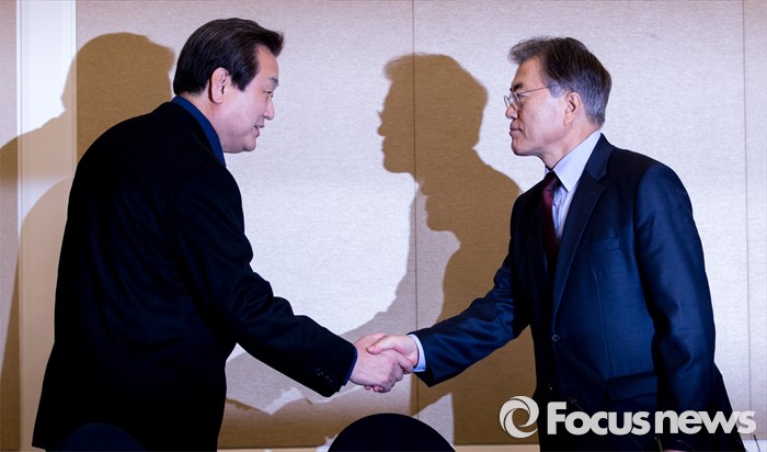 | △ 김무성(왼쪽) 새누리당 대표와 문재인 새정치민주연합 대표가 6일 오후 서울 여의도 국회에서 내년 20대 총선에 적용할 선거구 획정안 논의를 위해 만나 악수하고 있다. <사진제공=포커스뉴스> |