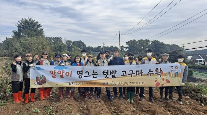 [부자동네타임즈 김인수기자] 백석1동 주민자치회(회장 이석구)는 지난 10월 14일 ‘알알이 영그는 텃밭’에서 직접 재배한 고구마를 수확했다고 밝혔다. ‘알알이 영그는 텃밭’은 백석1동 주민자치회가 직접 농산물을 길러 불우이웃에게 기부하는 활동이다. 주민자치위원들이 직접 밭을 일구고 잡초를 뽑으며 정성들여 고구마를 재배했다.