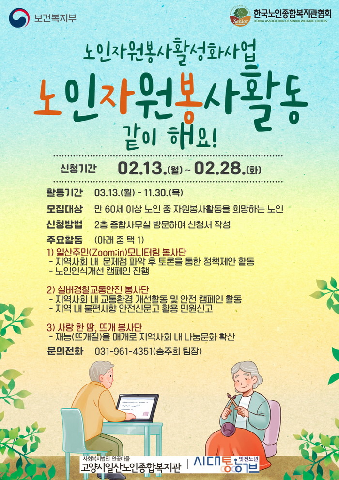 [부자동네타임즈 김인수기자] 고양시 일산노인종합복지관이 2월 13일부터 오는 28일까지 2023년 노인자원봉사 활성화 지원사업 ‘선배시민 자원봉사단’ 참여자를 모집한다.