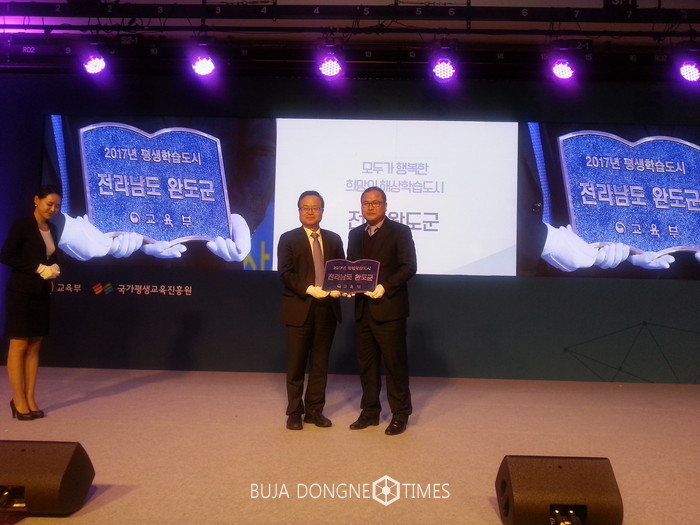 [부자동네타임즈 손권일 기자]완도군(군수 신우철)은 24일 서울 더-케이호텔에서 열린 대한민국 평생학습대전에서 2017년 신규 평생학습도시 증서와 동판을 수여받았다.