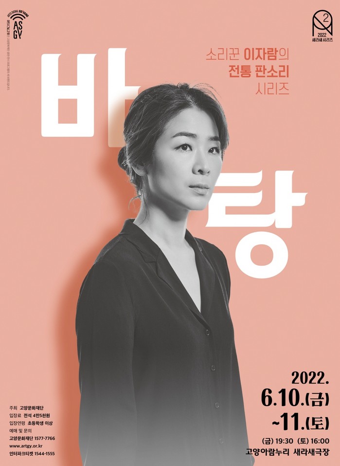 [부자동네타임즈 김인수기자] 고양문화재단(대표이사 정재왈)은 소리꾼 이자람의 판소리 갈라 시리즈인 전통 판소리 <바탕>을 오는 6월 10일과 11일 고양아람누리 새라새극장에서, 창작 판소리 <작창>을 7월 15일과 16일 고양어울림누리 별모래극장에서 선보인다.