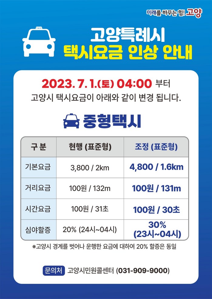 [부자동네타임즈 김인수기자] 오는 7월 1일부터 고양시 택시요금이 중형택시 기준 기본요금 3,800원에서 4,800원으로 1,000원 인상된다.