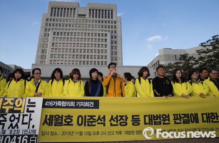 (서울=포커스뉴스) 12일 오후 서울 서초구 대법원 앞에서 세월호 참사 유가족들이 살인 등의 혐의로 기소된 세월호 이준석 선장 등 승무원들에 대한 선고공판 관련 기자회견을 하고 있다.