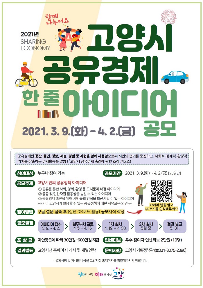 고양시 기획정책관 관계자는 “포스트 코로나19 시대를 맞아 시민이 체감할 수 있는 공유경제 사업을 발굴하기 위해 시작한 아이디어 공모에 많은 시민들의 참여를 바란다.”고 말했다.
