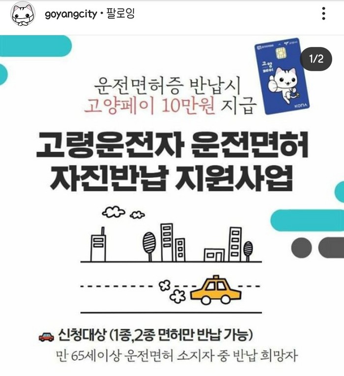 고양시는 2019년 500명, 2020년 1월부터 2020년 10월까지 운전면허를 반납한 3,155명의 고령운전자에게 고양페이 10만원 선불권을 등기우편으로 발송해 인센티브 지급을 완료했다.