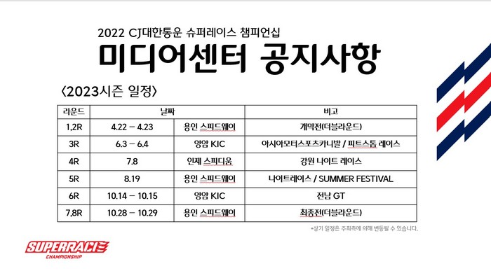 2022 CJ대한통운 슈퍼레이스 챔피언십은 7개월여에 걸친 5개의 클래스의 모든 일정을 마무리했다. 한편, 슈퍼레이스는 최종전이 열린 23일 2023 시즌 일정을 발표했다. 새 시즌은 4월 에버랜드 스피드웨이에서 개막한 후 10월 최종전까지 총 8라운드로 치러질 예정이다.