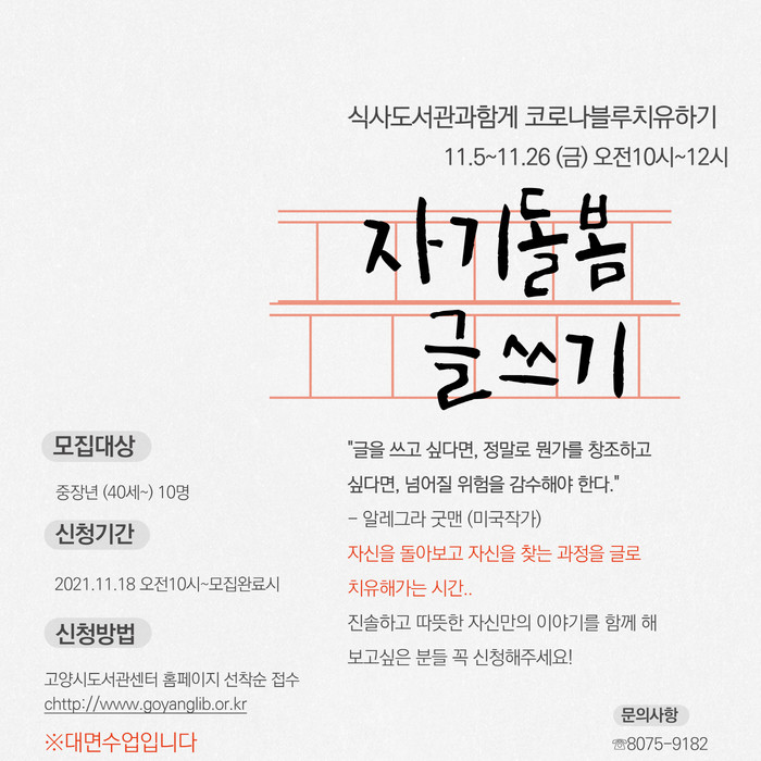 [부자동네타임즈 김인수기자] 고양시 식사도서관은 40세 이상 고양시민 10명을 대상으로 코로나19로 인한 우울감을 회복하고 자존감과 대인관계를 개선할 수 있는 「자기돌봄 글쓰기」를 오는 11월 5일(금)부터 운영한다.