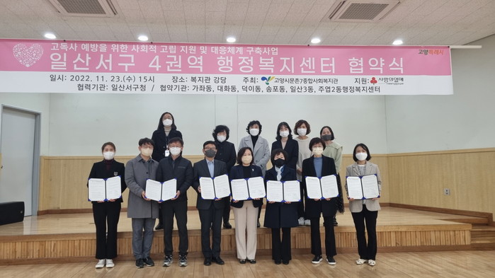 [부자동네타임즈 김인수기자] 고양특례시 일산서구(구청장 정윤식)는 11월 23일(수) 문촌7종합사회복지관에서 일산서구 관내 6개 동 행정복지센터와 문촌7종합사회복지관 간 고독사 예방을 위한 공동 업무협약식을 개최했다고 밝혔다.