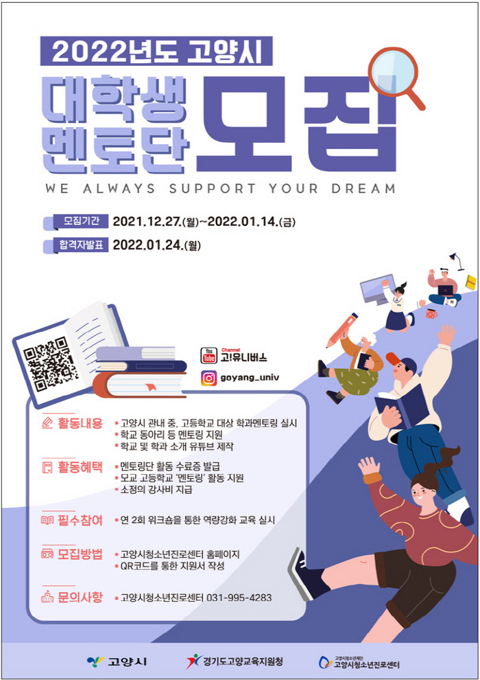 [부자동네타임즈 김인수기자] 고양시 청소년진로센터가 27일부터 고양시 중·고등학생들의 학과 선택 및 진로설계에 도움을 줄 수 있는 대학생 멘토단‘고양유니브’를 모집한다. 멘토단으로 활동하는 대학생에게는 소정의 활동비와 수료조건 충족 시 수료증, 우수멘토 표창도 주어진다.