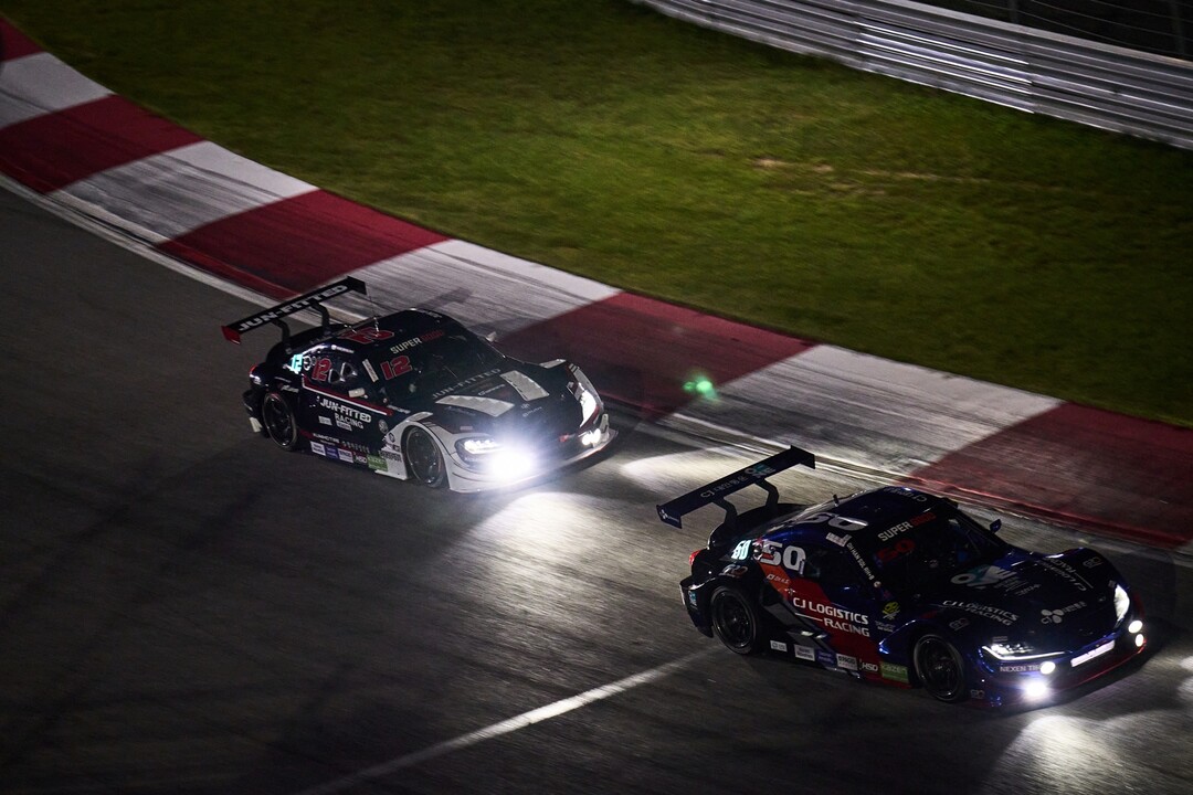 [사진설명] 2023 CJ대한통운 슈퍼레이스 챔피언십 4라운드 인제 나이트 레이스에서 황진우(12번)가 오한솔(50번)을 뒤쫓고 있다.